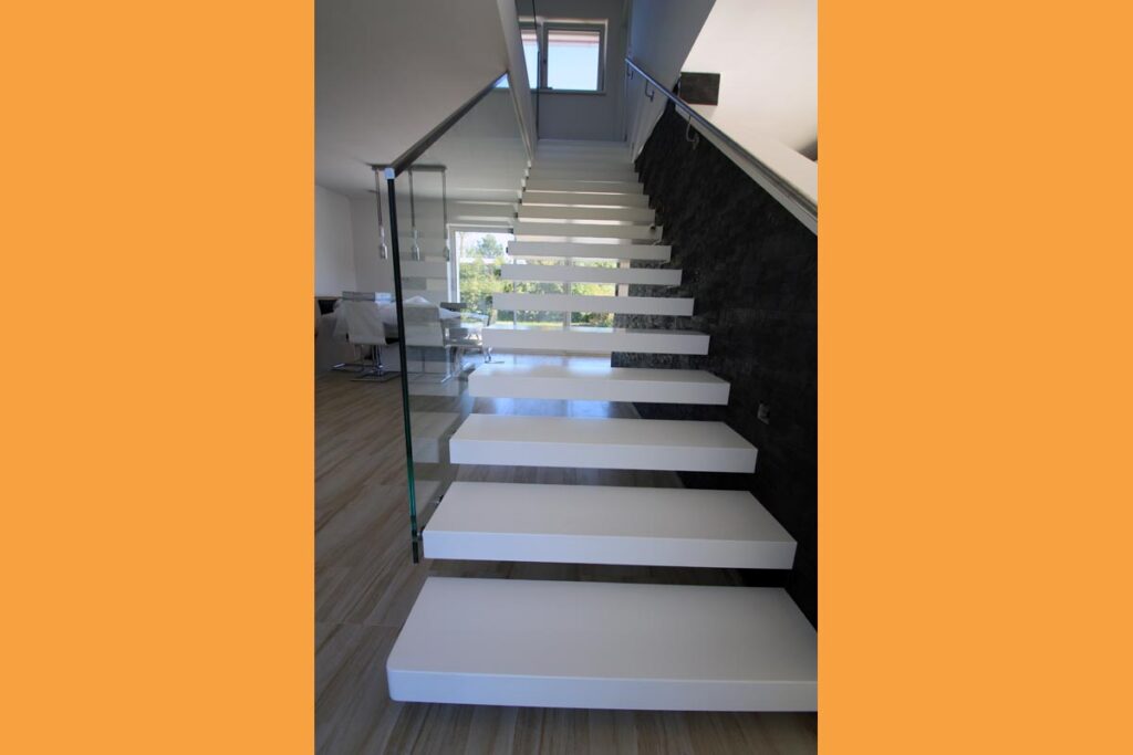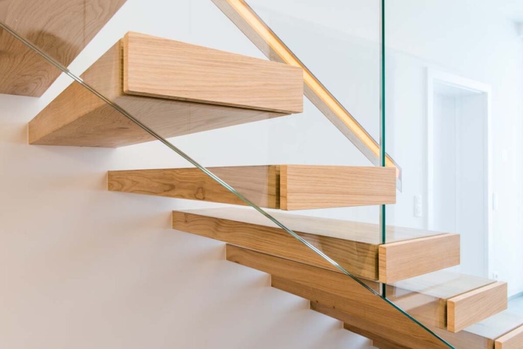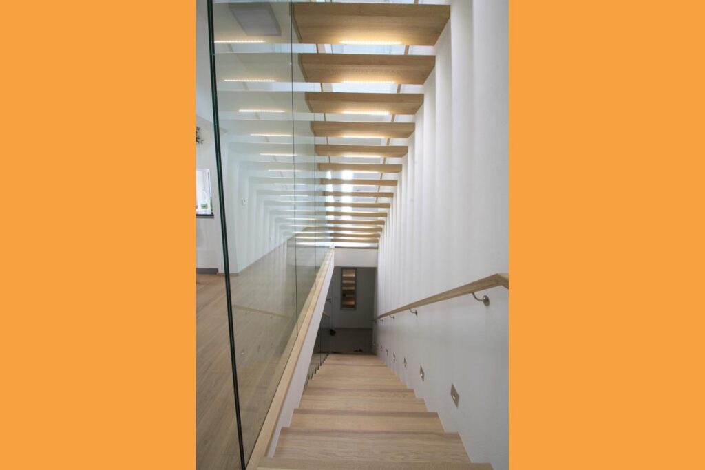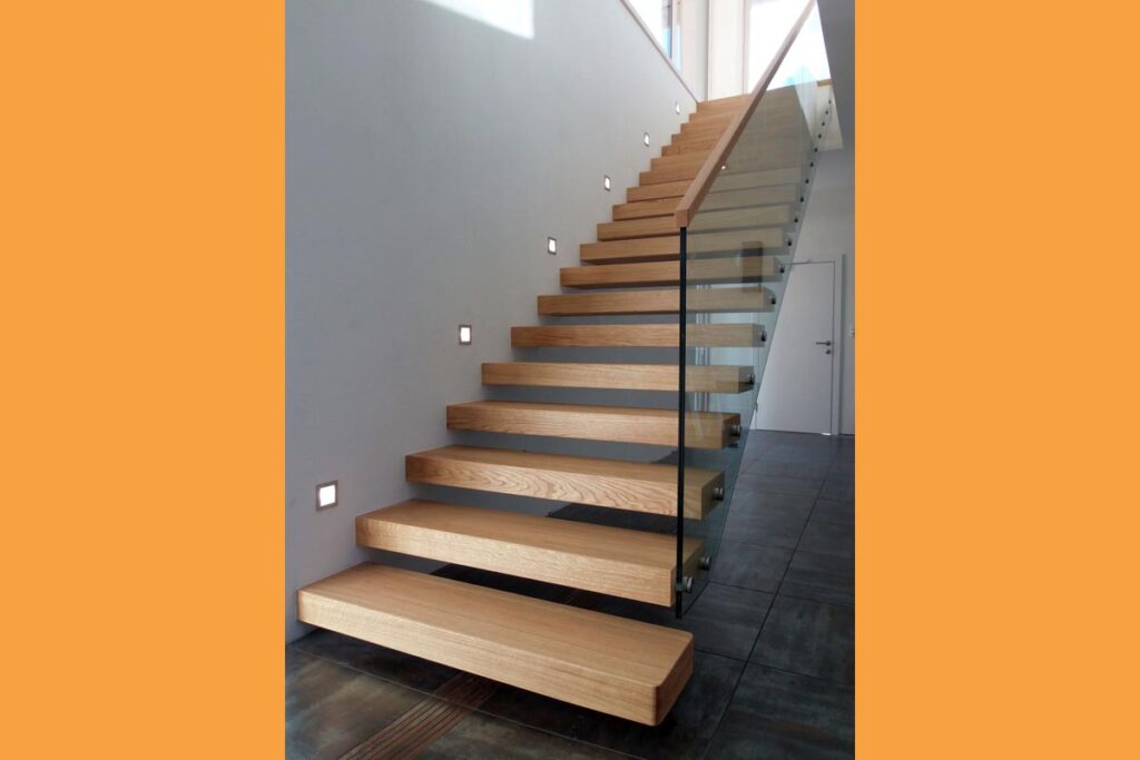 Kragarmstiegen „die Schwerelose“zeichnen sich durch eine freitragende Konstruktion aus, die mit einer nicht sichtbaren Metallunterkonstruktion in einer Holz-, oder Betonwand befestigt wird.